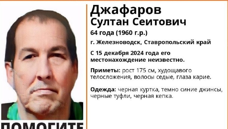 В момент исчезновения 64-летнего Султана Джафарова в Железноводске на нём была чёрная куртка, тёмно-синие джинсы, чёрные туфли, чёрная кепка. Приметы мужчины: рост — 175 см, худощавое телосложение, седые волосы и карие глаза. Всех, кто располагает какой-либо информацией о пропавшем Султане Джафарове, просят позвонить по следующим номерам телефона: 8 (800) 700–54–52 или 112. Ранее сообщалось, что в селе Донском пропал 60-летний пенсионер Владимир Никотин. Мужчина вышел из дома и не вернулся.