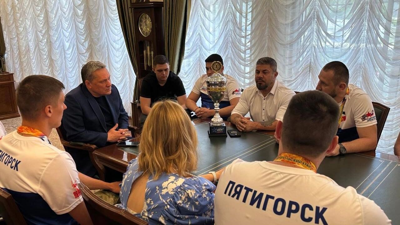 Мэр Пятигорска Дмитрий Ворошилов провёл встречу с командой участников специальной военной операции, ставших победителями краевого турнира «Кубок защитников Отечества». Участники встречи обсудили актуальные вопросы реабилитации и социальной поддержки ветеранов, их адаптации и интеграции в мирную жизнь после возвращения домой. Дмитрий Ворошилов поблагодарил ребят за несгибаемую волю, стойкость и мастерство, которые они проявили не только на поле боя, но и в мирной жизни. «Несмотря на тяжелые испытания, ранения и все трудности, с которыми они столкнулись в зоне СВО, ребята не сломались. Они не только вернулись к нормальной жизни, но и доказали, что сила духа помогает преодолеть любые преграды», — отметил глава Пятигорска.